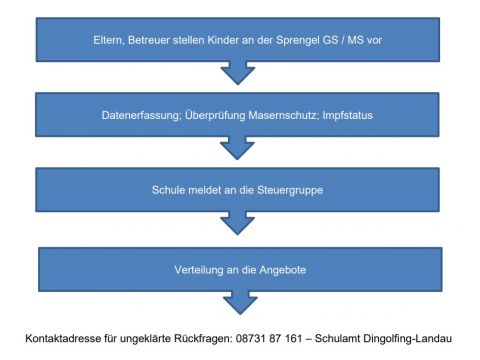 Um die Beschulung geflüchteter Schülerinnen und Schüler zu organisieren, wurde am Landratsamt eine Steuergruppe unter Mitwirkung von Vertretern aller Schularten im Landkreis gebildet. Derzeit laufen viele Anfragen, wie und wo die Beschulung erfolgen kann. Neben der Klärung inhaltlicher Fragen, geht es auch um organisatorische Aspekte und die Frage an welcher Schule sogenannte „Willkommensgruppen“ gebildet werden können. Diese bilden eine Möglichkeit, die Schüler vor dem Beginn der Schulpflicht, die 3 Monate nach Einkunft eintritt, schulisch aufnehmen zu können. Interessierte Eltern oder Betreuer bzw. Betreuerinnen können sich an der zuständigen Grund – bzw. Mittelschule melden. Dort werden die Daten erfasst und zur weiteren Bearbeitung und gegebenenfalls Verteilung der Schüler an die Steuergruppe übermittelt. Es ist vorgesehen, Willkommensgruppen bedarfsorientiert zu planen. Manche Schulen können die Schülerinnen und Schüler eventuell selbst sofort aufnehmen. Eine erste Kontaktaufnahme mit einer Schule bedeutet noch nicht, dass diese Schule dauerhaft besucht wird. Es kann auch sein, dass die Willkommensgruppe an einer benachbarten Schule, die evtl. auch ein Gymnasium oder eine Realschule sein kann, eingerichtet wird. Bescheinigungen über einen aktuellen Masernschutz sollten auf jeden Fall zur Anmeldung mitgebracht werden.