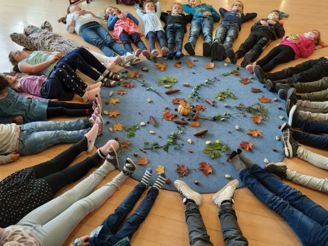 Ein gemeinsames Mandala aus Naturmaterialien wurde kurzerhand im Ethik- und evangelischen Religionsunterricht gelegt. Das gemeinsame Arbeiten und die Freude am gemeinsamen Werk stand im Vordergrund. Jedes Kind bekommt von Frau Großert als Erinnerung ein Foto.