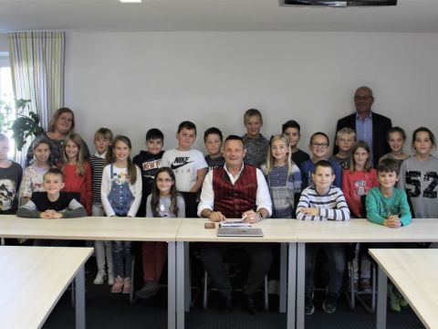 Im Heimat- und Sachkundeunterricht hatten die Kinder schon vorab besprochen, welche Aufgaben die Gemeinde hat, wie die Gemeinde arbeitet und woher sie ihr Geld bekommt. Doch selbst durch das Verwaltungsgebäude zu gehen und direkt im Standesamt, im Einwohnermeldeamt oder dem Bauamt zu stehen und Fragen stellen zu dürfen war etwas ganz Besonderes. Am Ende des Rundgangs wurden die Bürgermeister befragt. Die Klassen hatten nicht nur allgemeine Fragen zur Gemeinde vorbereitet, sondern auch an die Bürgermeister persönlich. Sie wollten zum Bespiel wissen, wie man Bürgermeist er wird und wie viele Stunden er zu arbeiten hat.