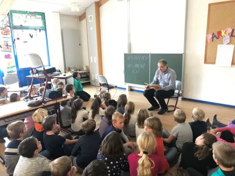 Der Leiter der Stadtbibliothek Dingolfing Thomas Jablonski nahm sich Zeit und kam an die Grundschule Gottfrieding zu einer Lesung aus verschiedenen Kinderbüchern.