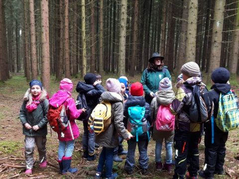 Mit Schal und Mütze dick vermummt versammelten sich die Kinder der Klassen 3a und 3b beim Hartlwirt in Lichting. Dazu begrüßte der Landauer Förster Tobias Schropp vom AELF sowie die zertifizierte Waldpädagogin Katharina Limbrunner die Kinder mit ihren Lehrkräften Kathrin Schwarzmeier und Ramona Büchner. Bevor es losging, gab der Förster den Schülern noch einige Verhaltensregeln mit auf den Weg. Unter anderem durften die Schüler keine Pilze anfassen und kein Feuer machen. Dabei stellte sich heraus, dass die Kinder bereits eine Menge wussten. Dennoch gab es viel Überraschendes zu bestaunen.