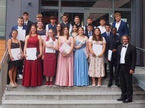 Klassenleiter Thomas Dießlin dankte allen Lehrkräften, die sich in den Jahren einbrachten. Ihm war schnell bewusst, die Klasse ist etwas Besonderes. Sie waren neugierig und hatten viele Interessen. Dabei wusste er von manchem Versuch zu berichten, die nicht immer schultauglich waren. Von hochanständigen und netten Schülern war im Lehrerzimmer oftmals die Rede: „das war schon fast beängstigend“, meinte er. Fleißig und höflich zeigten sie sich in den Praktika und machten darin auch so manchen Job fix. Von einer großen Gemeinschaft war die Rede und alle gaben ihr Bestes. Dabei kam die gute Laune und der Humor nicht zu kurz. Am Ende hat die Klasse den besten Quali geschrieben, den er in seiner Mamminger Laufbahn als Klassenlehrer jemals bekanntgeben durfte. Von 22 Schülern hat jeder seinen Schulabschluss und zehn davon haben sogar eine Eins vor dem Komma. Und davor zog er seinen Hut. Mit dem Lied „Auf uns!“ ging es zur Überreichung der Zeugnisse. Dabei wurden auch die sechs Schulbesten ausgezeichnet. Dies waren: Nico Mühlbauer, Sarah Ferby, Korbinian Kerscher, Stefanie Peer, Maria Hiergeist und Hannah Neubauer. Für die musikalische Umrahmung zeigten sich die Klassen 3a, 7a sowie Helena Wetzl unter der Leitung von Konrektor Helmar Ostermeier verantwortlich.