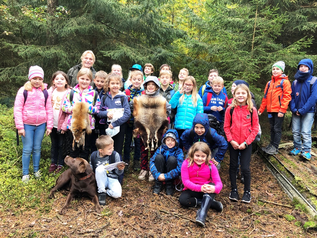 Bei etwas nebligem, aber trockenem Herbstwetter machte sich kürzlich die Klasse 3a der Grund- und Mittelschule Mamming-Gottfrieding mit ihrer Lehrerin Frau Dorfner und der Jägerin sowie Inhaberin der Marienapotheke Mamming, Frau von Riedesel, auf den Weg in den Bubacher Wald. Zur Freude der Kinder durfte Jagdhund Trapper die Gruppe begleiten.