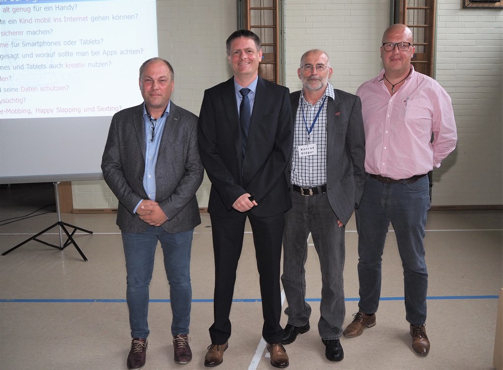 Bild: (v.l.) Rektor Matthias Weber begrüßte zum gemeinsamen Elternabend, Jürgen Wolf, Konrad Stöger und Christian Schuster referierten über die Gefahren im Internet.