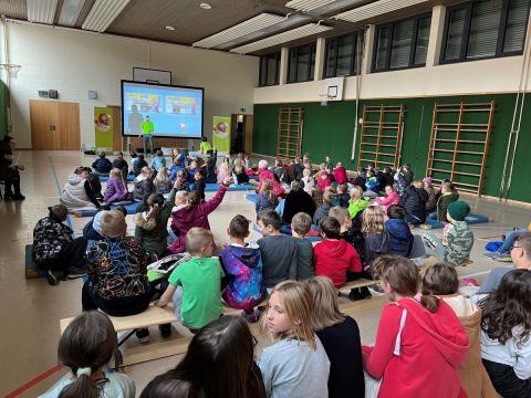 Schulleiter Helmar Ostermeier begrüßte ihn und die beiden dritten und vierten sowie die fünfte Klasse in der kalten, vom Heizungsumbau betroffenen Turnhalle, was er gleich nutzte, um in die Thematik einzuführen. Friedhelm Susok, der Infotainer aus Mülheim an der Ruhr, bedankte sich mit einem „Glückauf“, einer landesspezifischen Begrüßung der Bergleute seiner Heimat, die früher Kohle abgebaut hatten. Diese alten Zeiten sind allerdings vorbei: „Wir brauchen grünen Strom von der grünen Wiese für eine grüne Erde!“, war er sich mit den Kindern einig.
