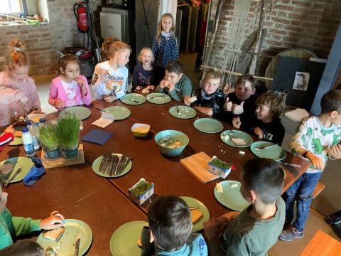 Am Folgetag besuchten die beiden Klassen gemeinsam den Kastenhof in Landau. Das Museum für Steinzeit und Gegenwart, das dort beheimatet ist, gab einen Einblick in das Leben der Steinzeit-Bäuerin „Lisar“. Bei einem interaktiven Rundgang und in einem Workshop mit dem Thema „Kleine Steinzeit-Küche“ konnten die Kinder eintauchen in die Welt der allerersten Bauernhöfe. Wie kam das Getreide nach Bayern? Wie sah damals ein Schwein aus? Wie anstrengend und aufwändig es war, Mehl zu mahlen, Butter herzustellen oder Feuer zu machen, durften alle in einem kindgerechten Workshop erfahren. Sogar Weichkäse stellten die Kinder selbst her!